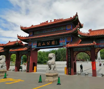 牡丹江市北山公园是黑龙江省唯一一座城市森林公园,建于1980年。位于新华路北端,东起中华路,西至民安路,南至体育场北界和北山宾馆北围墙,北到公园北山北侧山脚下。这里是牡丹江市爱国主义教育基地,2004年被市政府命名为市级“标兵单位”。牡丹江市北山公园是城市的天然氧吧,环境幽雅,景色怡人,是市民休闲、娱乐、游玩的理想之处。 北山公园位于牡丹江市区北山脚下,公园总面积96.6万平方米,海拔340米左右,主要由四座山和大面积的树木组成,属于以山林为主的自然风景区,是黑龙江省内少有的城市森林公园。 北山公园内设办公室、绿化队、财务股、管理股、护林防火队。绿地面积62公顷,清扫面积34.6万平方米,亭廊小品面积360平方米。共分5个功能区:游乐区、广场区、休闲区、山上区、植物园区。树木57种7.8万株,其中乔木6.9万株(针叶乔木5.6万株,阔叶乔木1.2万株),灌木9000株,绿篱4000延长米,草坪面积2400平方米,年栽花3万株。亭廊13个,环峰桥1座,纪念性建筑(牡丹江抗日战争暨爱国自卫战争殉难烈士纪念碑和为解放东北而牺牲的苏联红军烈士纪念碑两座)1处,灯饰4个品种,路灯98盏、高杆灯2座20盏、射灯5组10盏、大门霓虹灯1座。 园内有人文景观八处,著名的抗日战争暨爱国自卫战争殉难烈士纪念碑即矗立在公园入口处。该碑高24.13米,宽3.85米,碑顶立一尊左手持枪、右手投弹的战士铜像。正面标有纪念碑名和建碑铭文,两侧有中国人民前仆后继、浴血杀敌的浮雕,它记录了中国人民抗日战争和解放战争的历史。 纪念碑后的两山间有沟壑分为东西,沿山修有台阶300余级,可直登峰顶亭台,眺望市区全貌。因市区东西有金龙溪和银龙溪,故人们又称西面的台阶为金龙踏步,东面的台阶为银龙踏步。每天都有许多游人到北山公园爬山、打拳、跳舞……它已成为人们的游览、娱乐、休息的理想去处。